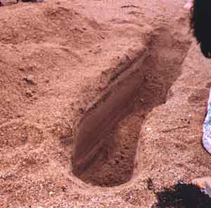 Now that we have seen and examined samples on the wrack line of the beach face, let's dig a trench to determine what lies beneath the sand and complete a scientific transect. Keep going, go down a little deeper. That's good, just about two feet into the sand. Let's discover what we have uncovered in our transect of the sand.