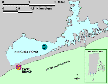 This map shows what the land area around East Beach and Ninigret Pond looks like. All the land is colored gray. The small map to the right will help you find where these places are located in Rhode Island.
