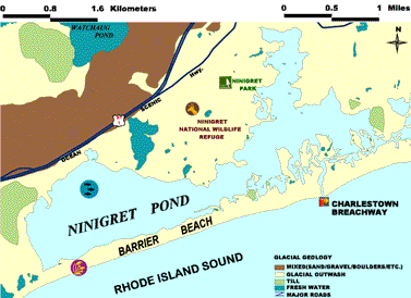 This is a map of the glacial geology of Ninigret Pond and East Beach. The mixed sediments in the brown area show the location of one of the last land glacier's leading edge. This area has a higher elevation than the areas surrounding it and is called the Charlestown moraine.