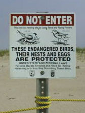 Are there any unique threats to wildlife on the beach?Some species, such as piping plovers, are threatened not by the harsh conditions of the habitat, but by an introduced species: MAN. Plovers nest in right in the sand on the beach and their precocious young run to the strand (wrack) line to feed. As a result, they are often stepped on and killed by unsuspecting people. In 1986, the plover was placed on the United States Endangered Species list. To protect nesting plovers and their eggs, wire cages are constructed around their nests to keep humans and predators away from the eggs. The cages have openings in the wire mesh that are large enough to allow the plovers to leave and forage for food but not large enough to allow predators entry.