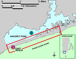 Where is East Beach located?East Beach is a two mile long barrier beach that separates Block Island Sound from Ninigret Pond. The barrier beach at East Beach lies parallel to Rhode Island's southern coastline between the Connecticut border and Narragansett Bay near the city of Charlestown. This narrow (660-990 feet or about 2-3 football fields) strip of sand protects the coastal lagoon (salt pond) ecosystem lying behind it from storms coming in from the Atlantic Ocean. The barrier beach extends eastward from Blue Shutters beach to the Charlestown Breachway.