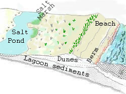 This cross section of a barrier beach and lagoon shows what you'd see if you cut a slice out of East Beach and Ninigret Pond. Going towards land you can see the beach, dunes, salt marsh, lagoon/salt pond, and the mainland.