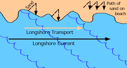 Waves and currents soon began moving and changing the glacial outwash sediments along the coast. As pebbles and rocks broke down, sand was formed. Sand is carried along the shore by longshore currents. These currents travel parallel to shore and carry sand particles suspended in the water. Waves move the sand onto the beach where some of it is deposited and some remains suspended in the water. This movement and deposit of sand particles along the beach is called longshore transport or littoral drift.