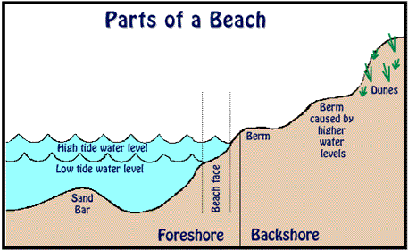 What is a beach?The beach is the area of a shore that is made up of loose sediments, especially sand. A beach covers the area from the low water (tide) line to the dunes. A beach primarily has two parts. The backshore is the area of dry sediments that is only covered by water during the highest tides or most severe storms. The berm separates the backshore from the foreshore, or intertidal area. The area just below the low tide line is sometimes included as a part of the beach because this is the area where most of the sand moves.