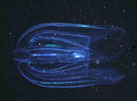 These clear, colorless invertebrates aren't like jellyfish- they can't sting you because they don't have pneumatocysts (stinging cells). When disturbed, the sea walnut produces a blue-green bioluminescent glow. |
