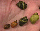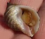 These gastropods share the rocky intertidal area with periwinkles but there aren't nearly as many. Dogwinkles are carnivores and their color depends upon what they eat. Those that eat blue mussels have a brown or reddish colored shell and those that eat barnacles are white or yellow colored. |