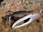 This small crab lives in a network of tunnels in the lower part of the salt marsh. Males have one very large and one small claw while both of the female's claws are small. The large claw on the males can be either on their right or left side, making them either right- or left-handed. |