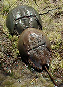 Sometimes called living fossils, these horseshoe shaped arthropods are brown in color and totally harmless. They migrate to shallow water to mate and lay their green-colored eggs. Horseshoe crabs are benthic and feed on worms and mollusks. When they swim their bodies are upside down. |