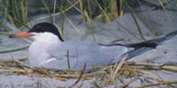 This smallest of New England's terns nests in colonies on sand dunes. This bird, ranging in size from 8 to 10 inches, has a white forehead, black cap, and gray back and wings. Adult terns will attack any creatures that pose a threat to their young. |