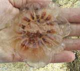 This jellyfish is very common in local waters in the summer. The color varies with the age of the jellyfish, ranging from dark reddish-brown to pinkish-yellow. In this area of southern New England, the lion's mane is usually around 6-12 inches but further north it can grow to 8 feet in diameter. Highly toxic sting from tentacles. |