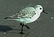 This small shore bird is one of three species referred to as peep sandpipers. Sanderlings feed at the water's edge on sandy beaches; they run up the beach to escape breaking waves, then rush back down to probe into the sand with their long bills for tiny crustaceans and mollusks. |
