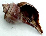 These large (8") whelks live in shallow water on a sandy bottom. They are aggressive predators, especially of clams, and even scavenge bait out of crab and lobster pots. These animals have a distinctive egg case that is often found washed up on beaches. |