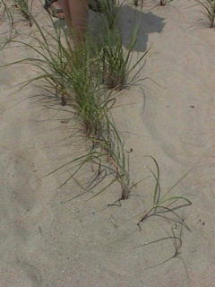 These hearty perennials control erosion of sand dunes with their extensive rhizome and root network. The plant is characterized by green blades and yellow seed heads. Beachgrasses reproduce both sexually and asexually (photo here is example of asexual reproduction). |
