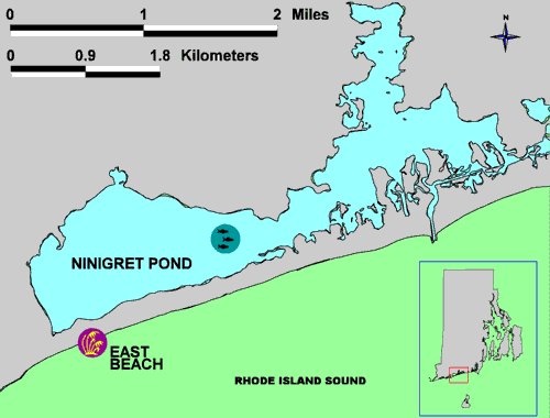 Ninigretsalt pond is located along the southern shore of Rhode Island. The very small blue box in the lower right corner marks the spot on the state's coast where we had our field trip. The larger map shows the shape of the pond and the barrier beach at East Beach. The salt pond is colored in blue and all the land areas, including the beach itself, are colored gray.