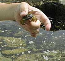 Ouch! A tiny Green Crab just bit my big toe...green crabs are one of many different kinds of crabs that we find in a tide pool. From Hermit Crabs to Rock Crabs, they love the still, warm water that is cradled in the walls of rock.