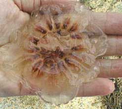A few jellyfish are floating around, they will probably wash out back into the ocean with the next high tide, for they tend to float and go with the "motion of the ocean".
