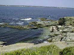 The first thing we notice as we are getting off the bus is how windy it is at Beavertail; good thing the teacher said to bring a jacket. The air seems damp and smells like salt water and seaweed. We are up pretty high on a rocky cliff, and see far out into the ocean. On foggy days, we've heard that you can't even see to the end of the rocks. We knew this was a Rocky Shore, not a Sandy Shore, but we were still surprised that there is no sandy beach here. People lay out on the rocks and wade in the tide pools. You can swim in the water, but the waves crash really hard against the rocks and it can be dangerous. Some rocks are high, some are sharp and could cut you, and some are very slippery. We proceed with caution as we walk towards the lighthouse.