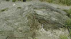 Geologists, people who study rocks and minerals, call these rocks phyllite. There are little spots of rust in some of the rocks. These are actually little specks of pyrite, or "fool's gold"