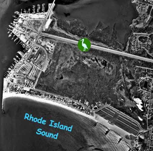 The Escape Road is one of the most noticeable features in this aerial photograph. The road runs in a basically east- west direction and the Galilee salt marsh symbol lies directly over it. This is to show that the field trip area lies on both sides of the road. The healthy marsh, the Bluff Hill Cove marsh, is on the north side of the road while the unhealthy or restored marsh, in the Galilee Bird Sanctuary, lies on the south side of the road.