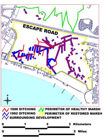 One of the ways to restore the salt marsh south of the Escape Road was to add a network of 4 by 2 foot channels. The purpose of the channels was to bring saltwater into parts of the marsh that were cut off from saltwater flow. The first ditches were dug in 1992 (blue lines) and more were dug in 1998 (red lines). A yellow line surrounds the restored marsh and a green line surrounds the area of the healthy salt marsh.