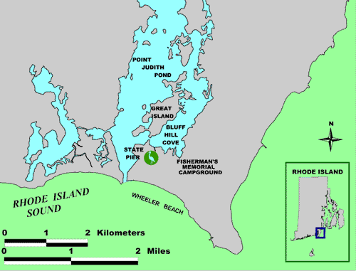 This map shows the general position of the Galilee salt marsh in the southern part of the state of Rhode Island (see small map in lower right). The land area is shown in gray color on this map while Narragansett Bay to the east and Block Island Sound to the south of the Galilee salt marsh are shown in green. The blue color designates coastal salt ponds (lagoons) located nearby.
