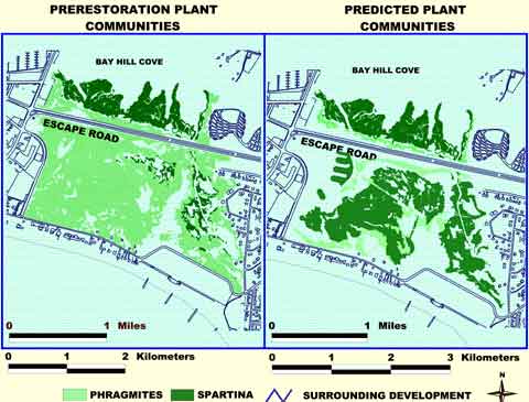 Vegetation Types This map is a before and after view of salt marsh plants. The map compares the plants that grew on both sides of the marsh before restoration of the unhealthy (south) side began with the plants scientists believe will be growing there once saltwater routinely enters all parts of the marsh. Spartina (dark green on map) and Phragmites (light green on map) are the genus (scientific) names of two common salt marsh plants. Spartina (cordgrasses) and Phragmites (common reed) are competitors for growing space in the marsh but cord grass tolerates saltwater and common reed doesn't. That is why you see alot of commom reed (large light green area) growing in the unhealthy side before the restoration began.