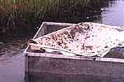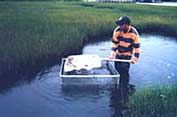 Kenny is wearing long, rubber waders and is stepping into the tidal pool next to the trap to scoop out the marsh life with his net.