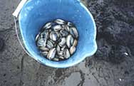 One of the clam diggers showed us the tool he uses to help him dig for the clams. It is called a clam rake and as he digs across the muddy bottom, the prongs of the rake bring the clams into a metal basket.