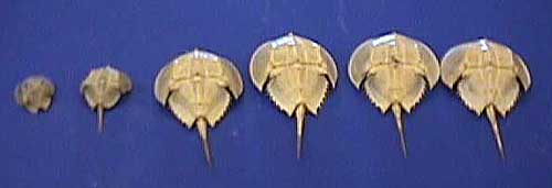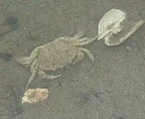 In the shallow water there are many different kinds of life. We find a green crab and a tiny, horseshoe crab.
