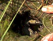 This large, green crab has wedged his way into a fiddler hole. Isn't it hard to see him? He uses camouflage well against the background of the sand and mud doesn't he? Do you think we can coax him to come out of his hiding place? Not a chance, huh?