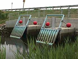 "The red globes are floats that allow the gates below them to open and close depending on the rise and fall of the tides. In this way, we can control the amount of flooding to this unhealthy area. Because there are homes built on the fringe of the unhealthy marsh, we have to keep those families from getting too much water into their backyards."