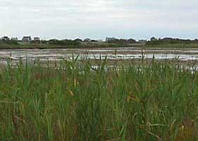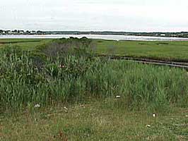 Now we can see the marsh! The part on the north side of the road is really big and green. There's water out beyond the grass.