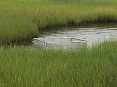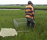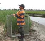Look! There is Kenny, the marine biologist, that we called before the trip. He has agreed to show us the trap he uses to count fish and other small animals that live in the marsh. He designed the 1 meter by 1 meter throw trap and dip net. Although it looks strange to some, he simply throws the trap into a marsh pool and then uses flat dip net to scoop up all the animals the trap caught.