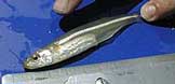 This is is incredible! Look at all those fish flopping! I've never touched a living fish before, especially one that is so small and fragile looking. What kind of fish do we have? Go grab the field guide. Look-silversides, killifish, and mummichogs. I don't know what this one is, do you have an idea? Given its shape and colors it could be a needle fish.